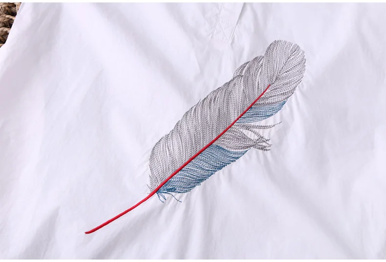 Special Offer 100% bawełna Plus rozmiar haft piórkowy biała długa bluzka kobiety 3 4 rękaw Art Loose Ladies praca w biurze topy przycisk w dół koszulki Discount 22% Today!