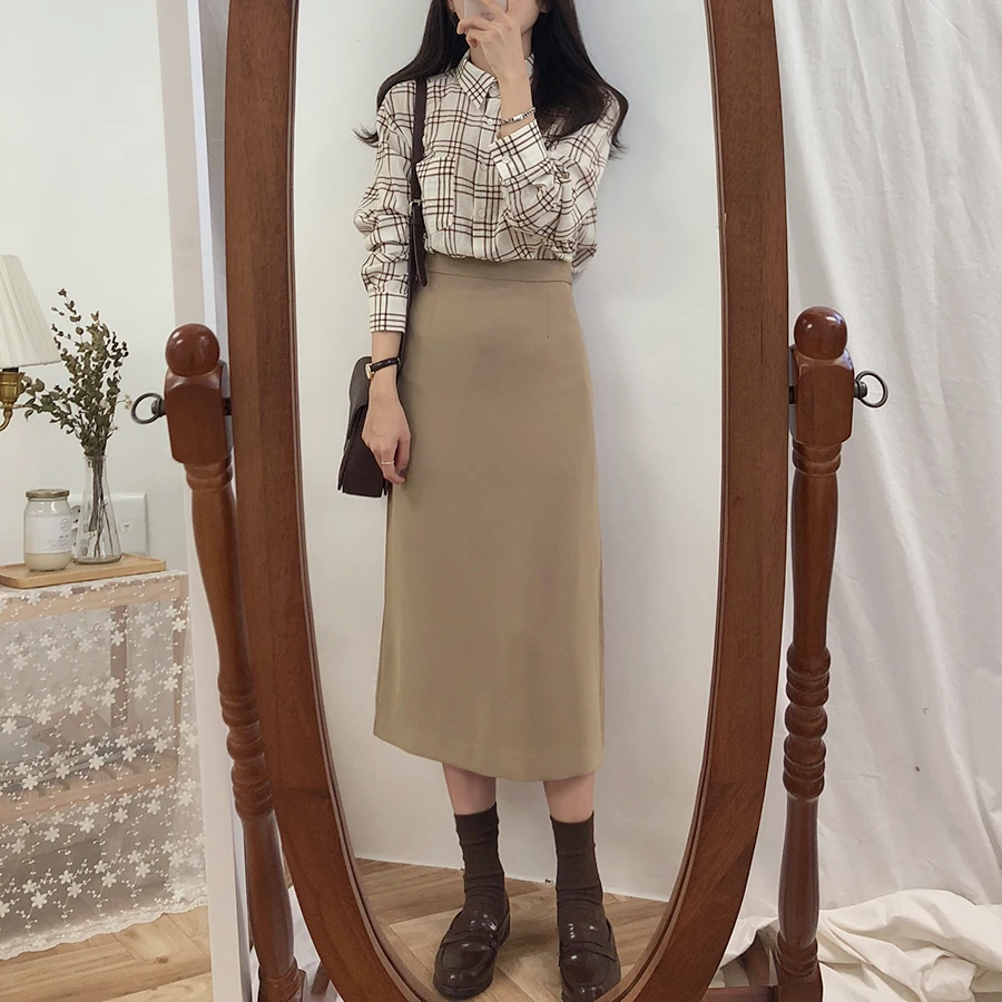 Special Offer Solidna czarna brązowa spódnica do połowy łydki kobiet w stylu vintage, wiosenna letnia prosta spódnica długie biuro Lady wysokiej talii spódniczki dziewczęce Femininas Discount 50% Today!