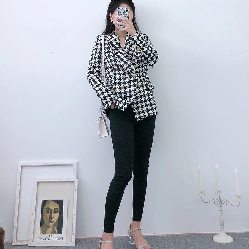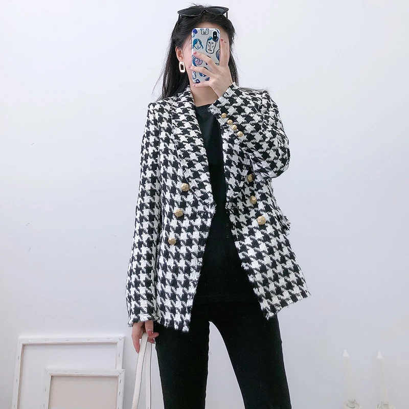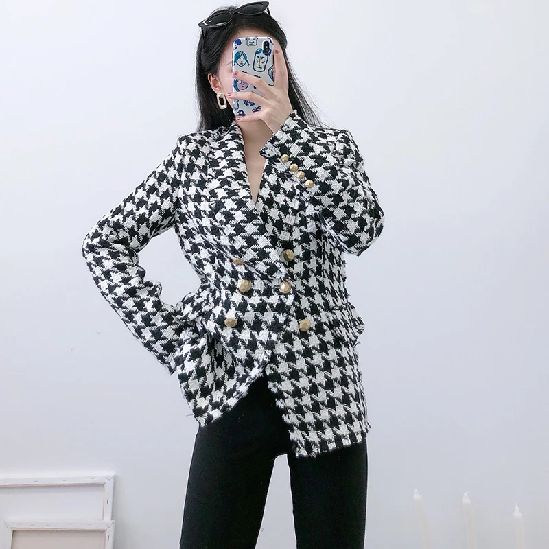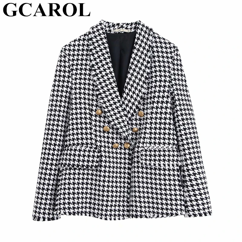 Product Name: GCAROL nowych kobiet garnitur w kratę Twist Tweed ząbkowane frędzle sprawdzone Blazer Feminino złote guziki jesień zima wielu okazji kurtka